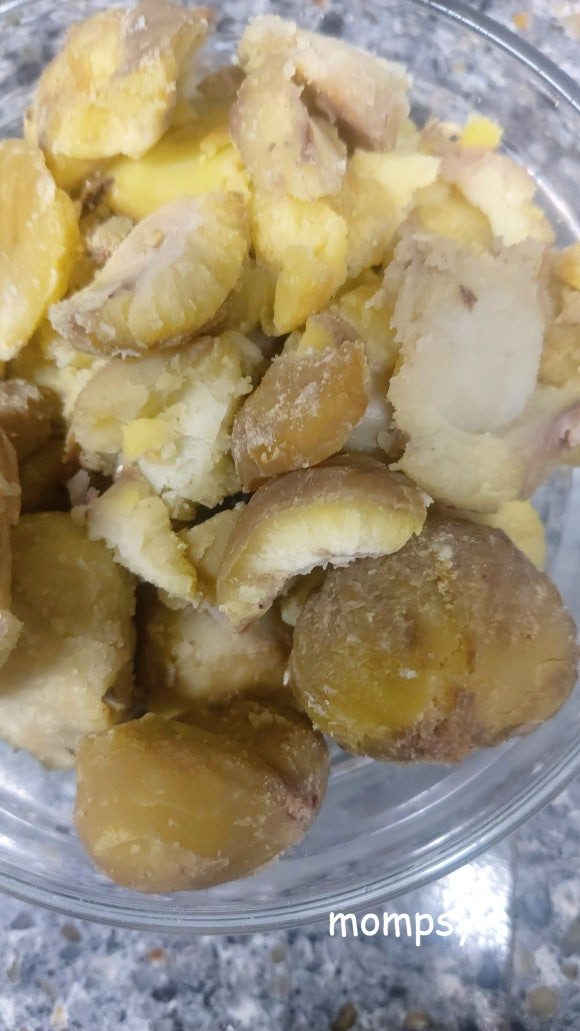 삶은 밤을 실리콘 주걱으로 대강 쪼개서